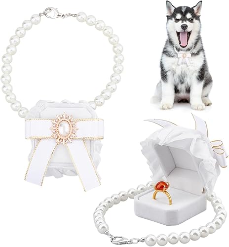 SUPERFINDINGS Pearl Wedding Dog Collar with Ring Box Rings Holder with Pet Rhinestone Couple Rings Bearer Case Cat Collar White Velvet Ring Box Collar for Proposal Engagement Wedding 13inch