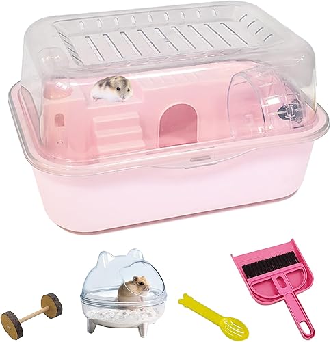 Hamiledyi Dwarf Hamster Cage Clear Plastic Small Hamster Cage Portable Carrier with Water Bottle Exercise Wheel Bathtub Box Set Toy for Dwarf Baby Hamster (Pink)