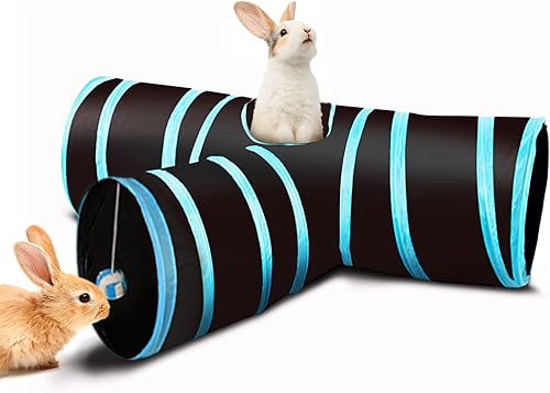 SunGrow 3-Way Ferret & Rabbit Tunnel, Bunny Hideout Activity Tube with Peep Hole and Crinkle Ball, Accessories for Hiding, Resting for Dwarf Rabbits Bunny Kitty Guinea Pig, Turquoise and Black