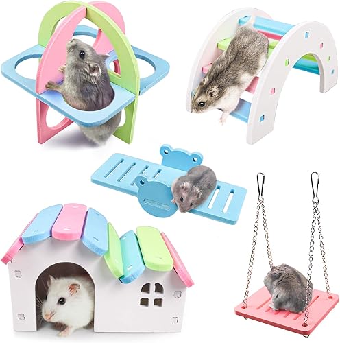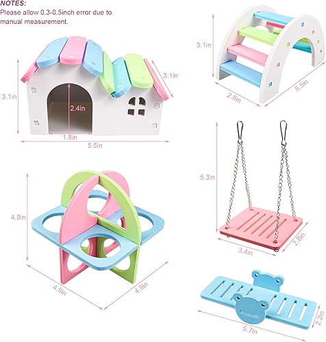Dwarf Hamsters House DIY Wooden Gerbil Hideout Rainbow Bridge Swing and PVC Seesaw, Pet Sport Exercise Toys Set, Sugar Glider Syrian Hamster Cage Accessories, Suitable for Small Animal Habitat
