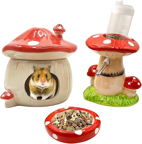 Mushroom Ceramic Hamster Hideout, Water Bottle with Stand, Food Bowl, Hamster Accessories (red)