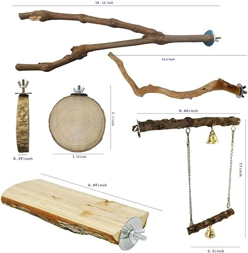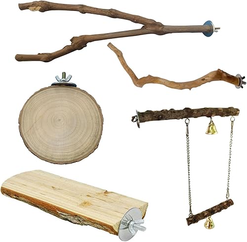 5PCS Natural Wood Stand 2 Wooden Platform 1 Swing 1 Grape Stick Paw Grinding Fork 1 Azalea Wood Stand Cage Accessortes for Birds