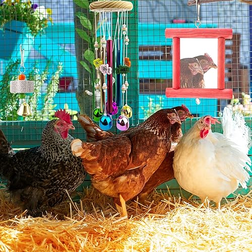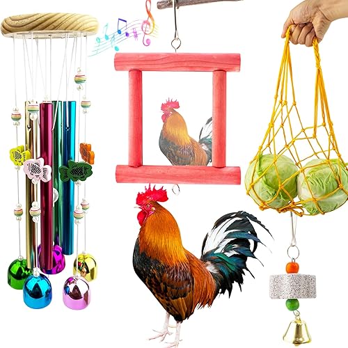 FlidRunest 4PCS Chicken Coop Toys Set, Hanging Chicken Wind Chime, Vegetable String Bag, Coop Mirror Toy and Beak Grinding Calcium Stone, Musical Enrichment Accessories for Hens Poultry Chick