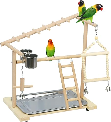 Pet Parrot Playstand Parrots Bird Playground Bird Play Stand Wood Perch Gym Playpen Ladder with Feeder Cups Bells for Cockatiel Parakeet (4 Layers)
