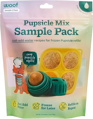 WOOF Pupsicle Mix Sample Pack - Easy-to-Make DIY Pupsicle Refills - Delicious Mix for The Pupsicle Interactive Dog Toy - with Bacon & Cheese, Calming, Balanced Belly, and Dental Mix - 4 Pack Sampler