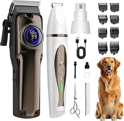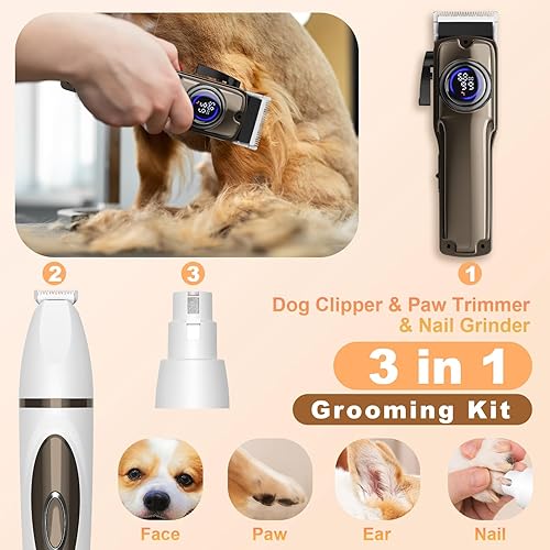 Dog Grooming Kit, Dog Clippers for Grooming Paw Trimmer Nail Grinder, Low Noise Rechargeable Cordless, Pet Shaver with Stainless Steel Blade for Pets Cats Animals