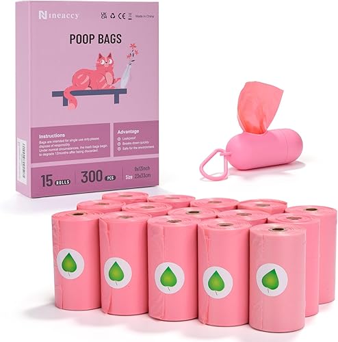 Biodegradable Pink Dog Poo Bags Lavender scent with Dispenser - 300 Large Poop Bags, Extra Thicken Strong Corn Starch Blended Compostable Leak Proof Poop Waste Bag for Dogs