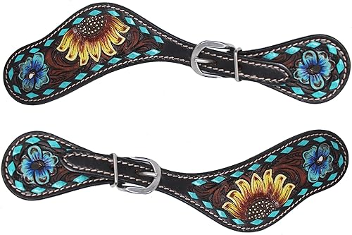 CHALLENGER Horse Western Sunflower Turquoise Painted Leather Adjustable Boot Spur Straps 74FK30