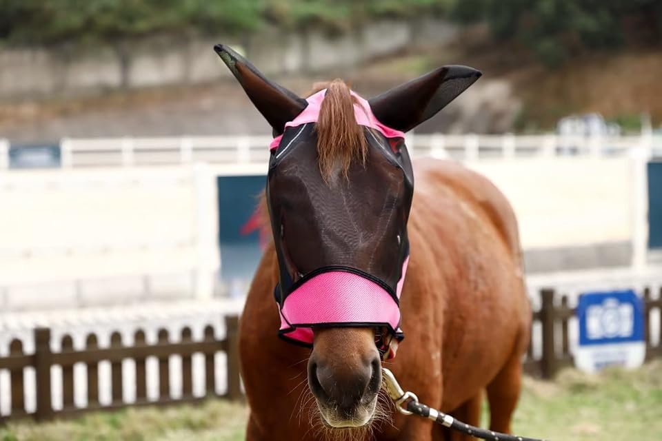 Horse Fly Mask – Stretch UV-Protective Full-Face Mesh with Ears, Pink
