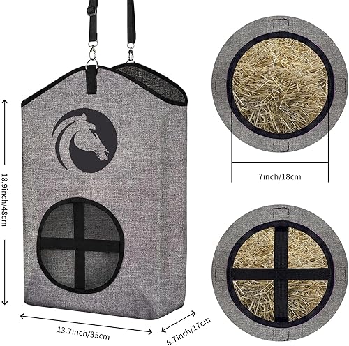 Goat Hay Feeder Bags for Horses, Sheep with Adjustable Open Feed Hole for Slow Feeding-Gery