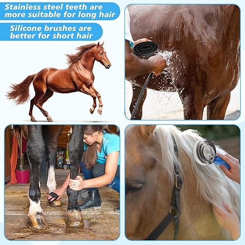 2 Pack Reversible Stainless Steel Curry Comb with 2 Rubber Brushes 4 Rings Curry Comb Horse Brush with Comfortable Grip for Grooming Horses Dogs Goats Cattle Cow Donkey Supplies