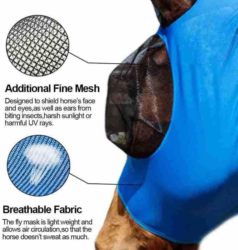 Super Comfort Stretchy Horse Fly Mask 2 Pcs Long Nose with Ears Space with UV Protection Soft on Skin with Breathability (Blue, Black - Full Size)