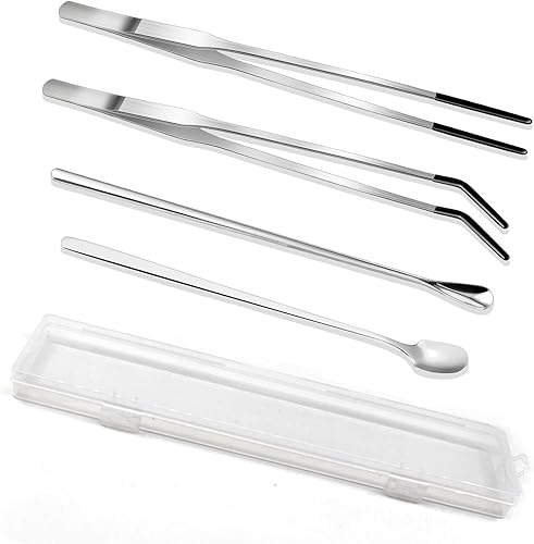 4-Piece Stainless Steel Reptile Feeding Tongs & Spoons Set – Curved/Straight Tweezers,Spoons, Rubber Tips for Bearded Dragons,Aquarium/Terrarium Safe Feeding Tools