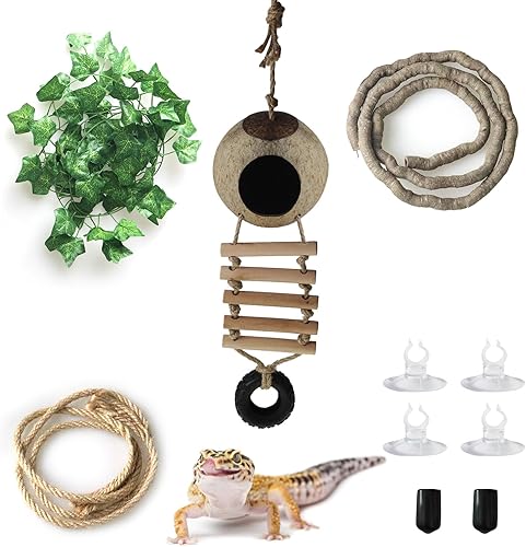 NANEEZOO Leopard Gecko Tank Accessories - Coconut Husk Hut Hideout Cave with Ladder - Reptile Climbing Jungle Vines and Plants Decor for Chameleon Lizard Gecko Snake Hermit Crab