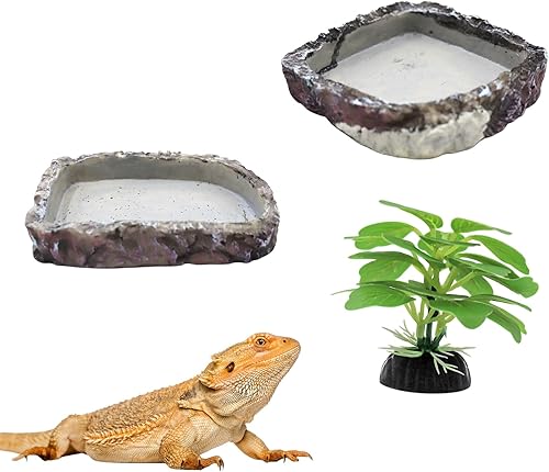 Bearded Dragon Accessories, 2 Pack Reptile Bowl for Feeding and 1 Artificial Plant Decor, Aquarium Habitat Decoration Set for Bearded Dragon, Gecko, Tortoise, Snake, Frog, Other Small Reptile