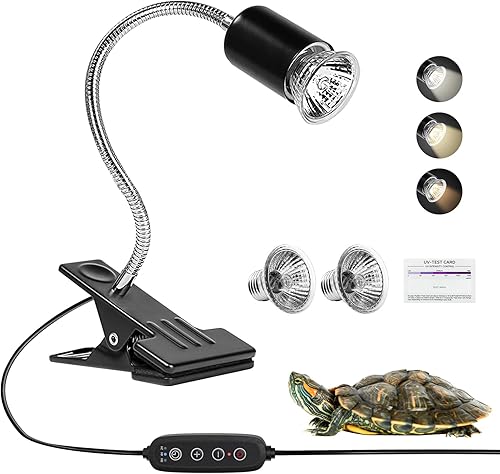 Reptile Heat Lamp Turtle Light - Long Lasting Ceramic Socket Basking Lamp with Auto Timer & Dimmer, 2 E27 Bulbs (25W & 50W) with UVB Support & Test Card for Turtles, Tortoises, Bearded Dragons, Geckos