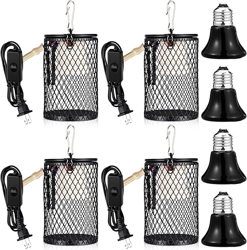 Retisee 4 Pcs Reptile Heat Lamp with Guard Bird Cage Heater 100w Ceramic Bulb Anti-scalding Heat Lamp Holder Bulb Short Grid Cage with Anti-bite Hook and Power Switch for Parrot Lizards Snakes Chicks