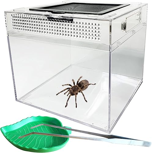 kathson Reptile Feeding Box Lizard Tank Enclosure Hermit Crab Habitat Reptile Terrarium with Tweezer Bowl for Frog Spider Gecko Tarantulas 7.87x7.87x7.08 Inch (Small)