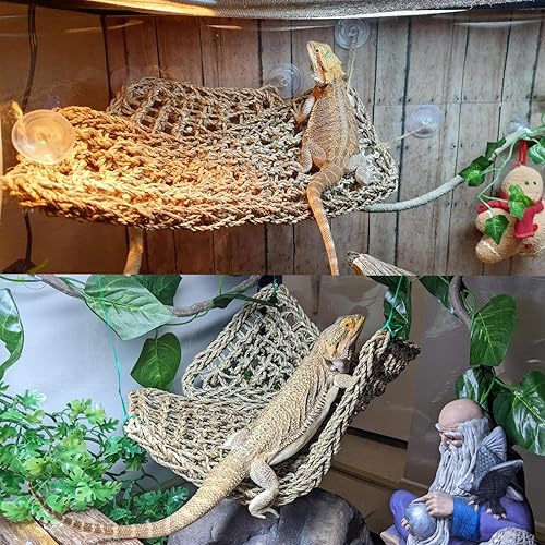 PINVNBY Bearded Dragon Hammock with Suction Cups,Lizard Lounger Natural Seagrass Reptiles Hammocks Reptile Tank Accessories Jungle Plants Climber Vines Leaves Habitat Decor for Lizards Chameleon Gecko