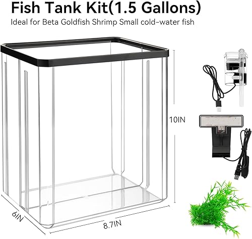 【All-in-One Aquarium Kit】: This 8.7"L × 6"W × 10"H beta fish aquariums (1.5 gallons) ships with everything needed—1*fish tank, 1*silent pump, 1*tricolor led light, 1*plastic water plants. You just need to prepare water and fish. Transform any space instantly into a vibrant, maintenance-minimal aquatic showcase