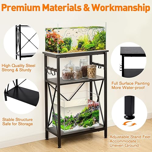 【High Quality Steel & Anti-tilt Device, Sturdy & Safe】The aquarium stand is made of strong steel. All the surface is covered with paint, more water-proof and prevents moisture. You can use the aquarium stand for a long time. To ensure a safe usage experience, an L-shaped corner code is included to prevent tipping, more stable and safer. On the bottom, adjustable table feet can accommodate uneven ground, enhancing stability.