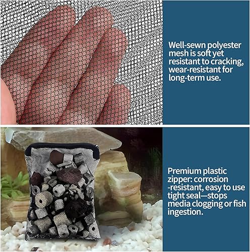 Secure Zipper Design, Easy to Use – Premium plastic zipper won’t corrode. Easier to load and empty than string bags, provides a tight seal that prevents loose media from clogging pumps or being swallowed by fish.