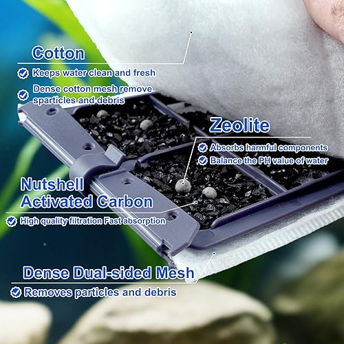【Four-Stage Filtration】The filter is made of dense dual-sided mesh, the better the filtration effect. With 25% more active activated carbons and zeolites are added to effectively filter and absorb impurities in water, maintain a clean water source, and provide a healthy growth environment for fish.