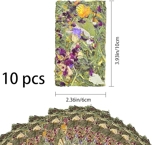 Natural Material: Guinea pig treats timothy hay toy.Rabbit timothy hay chips is a natural non-additive pet snack, without any chemical additives, made of natural timothy grass,stone bamboo leaves,calendula, lotus leaves,roses and stevia after hot air baking and pressing.