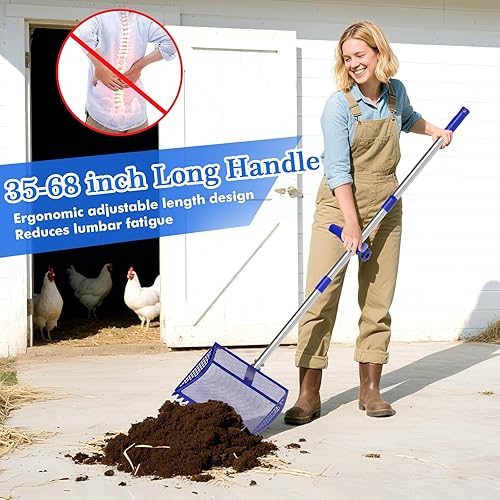 Large-Capacity Metal Chicken Poop Scooper : Constructed with a heavy-duty metal shovel head and rake, paired with a 304 stainless steel handle and an adjustable soft rubber grip, it is suitable for use year-round. The metal-toothed chicken manure shovel head measures 12 inches in width, with a curved groove design significantly increasing the shovel's capacity, enabling it to scoop and sift waste in a single pass, greatly enhancing work efficiency.