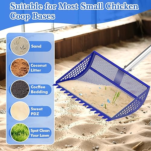 Multi-Purpose Chicken Poop Scooper: Not only can it be used as a chicken manure shovel, but it can also serve as a cat litter shovel, beach sand shovel, and cattle pen shovel. What sets this chicken coop shovel apart is its rake teeth, enabling quick removal of chicken manure and other waste. The scooper mesh section of this scooper features an approx. 1.8 cm aperture, which is 300% more efficient than a regular screen and ensures thorough cleaning.cleaning.