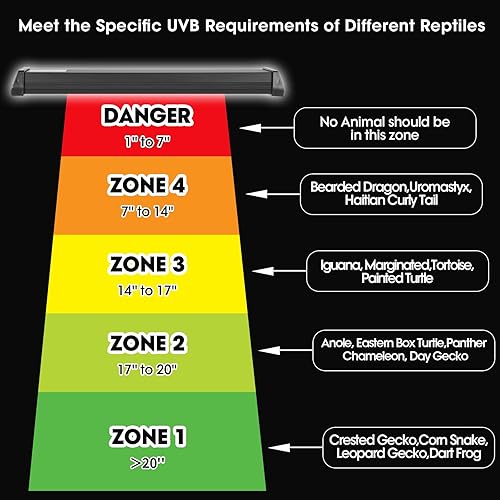 [Meet the Specific UVB Requirements of Different Reptiles] produces beneficial UVB, UVA, and visible light, check the Ferguson Zone chart to see how far to place the lamp from the basking spot for your reptile