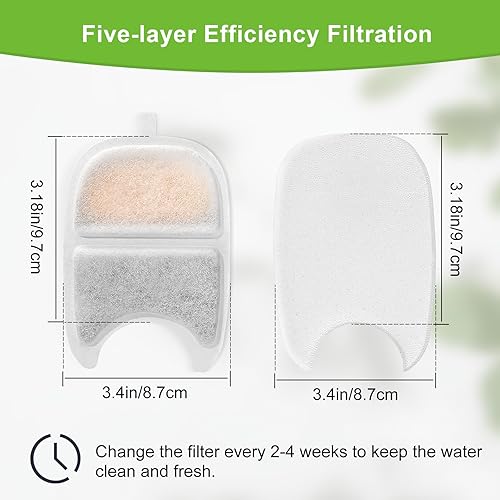 【Replacement frequency】: To keep the drinking water fresh and hygienic, it is recommended to change the pet fountain filter every 2-4 weeks, depending on the number of cats in your household. Before using the replacement filter for the pet fountain, rinse it thoroughly under running water and insert the replacement cartridge into the cat fountain.