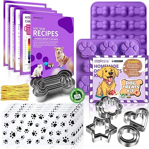 PACKS:Our make dog treat making kit includes 2 silicone dog treat mold, 5 dog cookie cutter, 3 heart cookie cutter, 3 round cookie cutter,3 star cookie cutter,3 flower cookie cutter,50 dog treat gift bags and gold twist ties and 4 cards(7 healthy recipes).