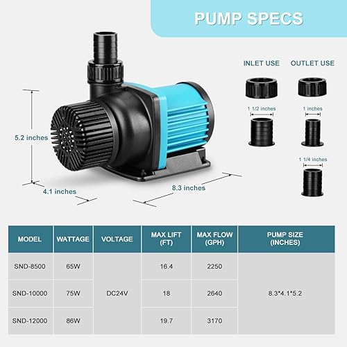 Specifications:1250GPH Max flow aquarium pump, ECO 32W DC24V return pump, 13.1 feet max lift;pump dimension (L*Wx*H):7.5*3.5*4.8 inches.