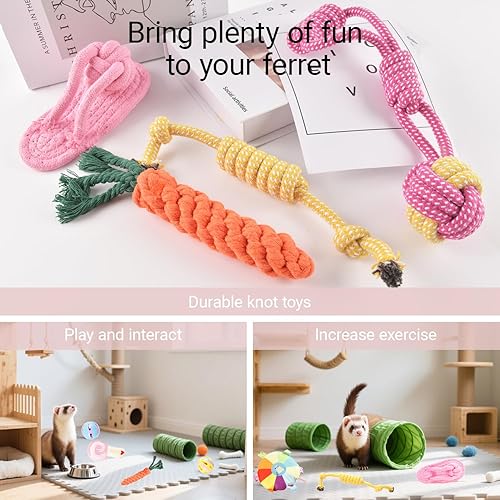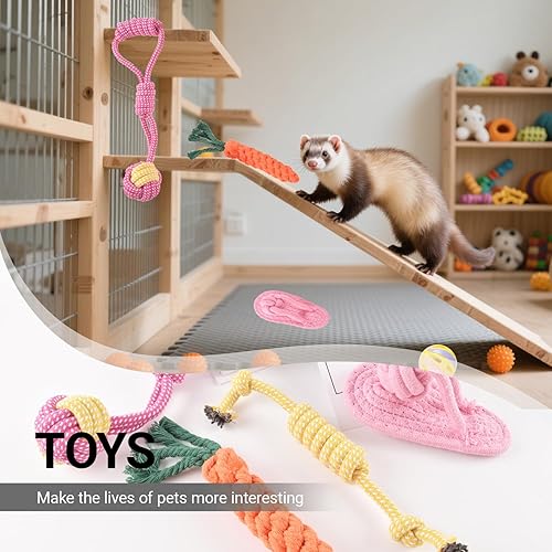 Ferret Chew Toys: Keep your furry friends not boring in cage with our 4 specialized chew toys! From the classic rope and bouncy rope ball to the whimsical slipper and carrot shapes, these toys are designed to withstand even the most enthusiastic nibblers.