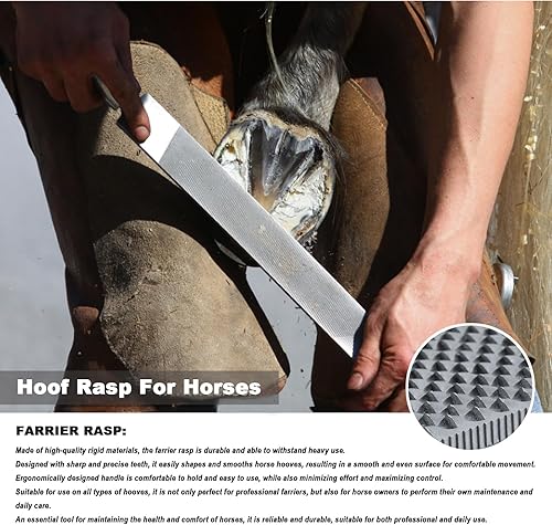 【File Side for Efficient Cut】-The Farrier Tool Kit also includes a file side with small teeth and a concentrated pattern, making it perfect for an efficient cut in dry environments or for harder hooved horses. The wider cut file side allows for more efficient flattening and leveling, leaving a smooth finish.