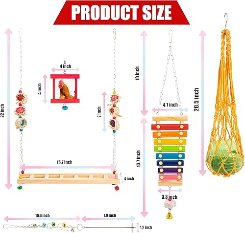 Easy to install :Each toy comes with a hanging hook, no installation required. And the hanging design of the vegetable feeder and veggies skewer ensures the freshness of vegetables and fruits. The chicken swing and xylophone toy are specifically designed for chicken entertainment.