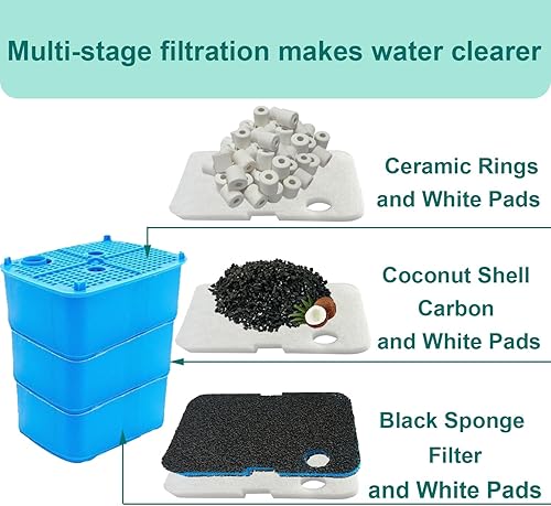 Package Includes: You will get 2 bio sponge filters, 6 white floss pads, 2 activated carbons, 2 ceramic rings and 4 mesh bags (16-piece set)