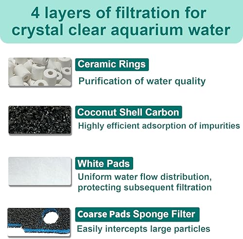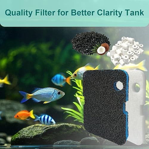 Multiple Filtration: Activated carbon purifies water by removing odors. Ceramic rings aid filtration. Filter pads collect particles effectively. Bio sponge removes ammonia and nitrite, keeping aquariums clean, healthy and odor-free