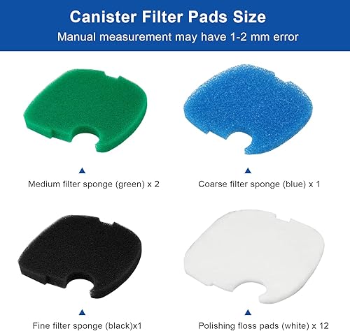 【16-Piece Canister Filter Pads】The package includes 16 reusable replacement for SUNSUN canister filter replacement parts: 1 coarse sponge bio filter pad (blue), 2 medium sponge bio filter pads (green), 1 fine sponge bio filter pad (black), 12 polishing floss pads (white). These canister filters for aquarium capture most visible impurities while not obstructing water flow.