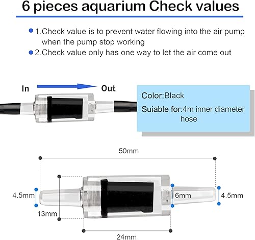 6 pieces aquarium check value to be connected to aquarium fish tank air tubing which can stop waterback into the fish tank air pump from the fish tank bubble stone to avoid affecting the aquarium air pump.