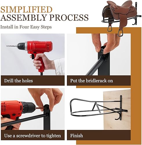 Space-Saving Wall-Mounted: Designed for narrow spaces, the wall-mounted installation (5 mounting screws included) allows easy integration into stables, indoor display areas, etc. Equipped with a briddle hook,it frees up floor space, making storage organized and visually appealing
