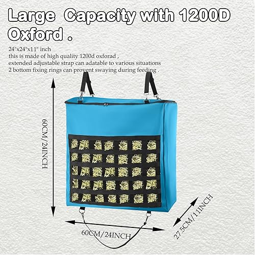 【Easy to Use】Two adjustable straps make it easy to hang the hay bag on the fence.There is a metal buckle on bottom to securely fasten the hay bag.A must-have for your daily horse care.
