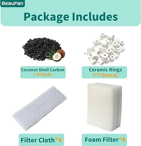 Package includes: 4 Sponge Filters, 4 Tarpaulins, 4 Activated Carbons, 1 Pack Ceramic Ring
