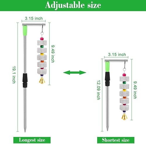 Durable & Attractive Design - Crafted with a sturdy aluminum ground stake (silver) and 5 colorful volcanic stone chewing toys featuring wooden beads and bells. Perfect for chicken coops, lawns, or cages, blending functionality with vibrant visual appeal.
