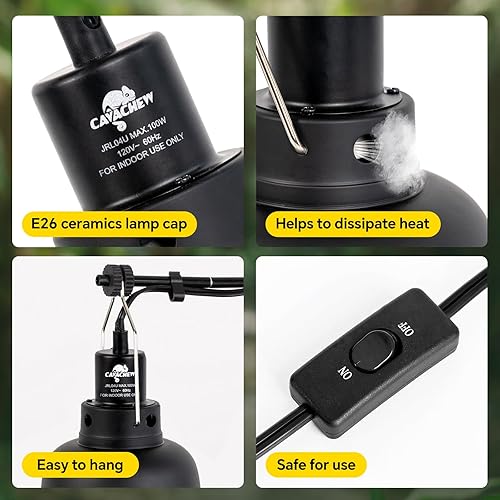 Easy & Safe for Use: CAVACHEW reptile heat lamp fixture uses independent switches and hooks, easy to install and safe for use. Equipped with heat dissipation holes, which can extend the service life of the bulb.