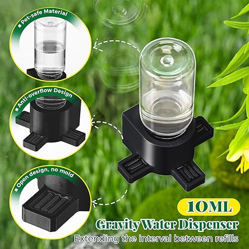Convenient Pet Water Dispenser: When operating, please invert the water bottle as shown in the diagram to prevent leakage. This 10ML gravity water dispenser can automatically provide water slowly, extending the interval between refills. You can place these sturdy drinking feeders at any height in your pet's habitat, making it perfect for jumping spiders, tarantulas, or other arboreal animals