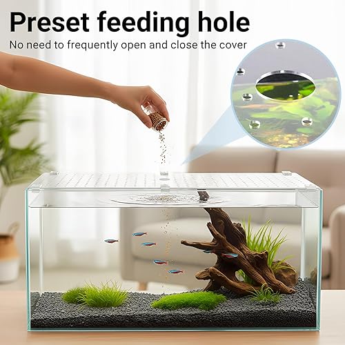 Convenience Feeding Port and Ventilation Hole: the Glass Canopy Set lid has a preset feeding port, which is convenient for daily feeding without frequent removal of the cover; The multiple ventilation holes are designed to ensure air circulation, maintain the oxygen content in the tank, and prevent water vapor accumulation; Improve the comfort of pets