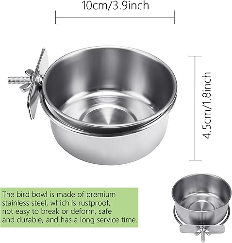 STAINLESS STEEL BOWL: Diameter: 10cm/3.9 Inch, Height: 4.5cm/1.8 Inch, Weight: 103g. The bird bowl is made of premium stainless steel, which is rustproof, not easy to break or deform, safe and durable, and has a long service time. It is perfect for your pet's long-lasting use. This bird bowl has two parts: the holder and the stainless steel bowl