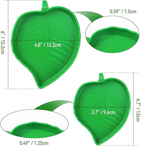 2 Sizes: Contains 2 sizes of leaf shaped water bowls, the smaller leaf reptile bowl measures 4.72 x 3.74 x 0.47 inches/12 x 9.5 x 1.2 cm, the larger leaf reptile bowl measures 6.06 x 4.88 x 0.59 inches/15.4 x 12.4 x 1.5 cm; meets the needs of reptile pets of different sizes